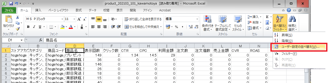 エクセルの画面で「並べ替えとフィルター」を選択して、「ユーザー設定の並び替え」を押します。