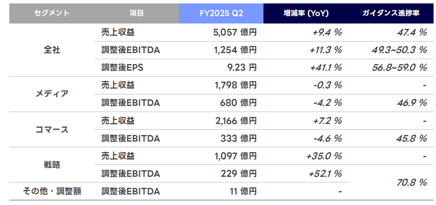 しかし、2点目のLINEヤフー株式会社として重視しているという部分の影響もあります。2025年第2四半期の決算ではメディア部門(広告などのこと)の売上も利益も落ちています。※EBITDA(イービットディーエー)とは減価償却費を引く前の利益で、単純な儲ける力を計測する指標です。