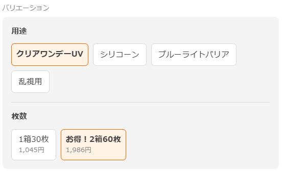 以下の例はコンタクトレンズの商品ページですが、2個セットの選択肢を「お得!2箱60枚」とすることで2箱の商品ページに来た人にも、今見ている2箱はお得だと訴求しています。