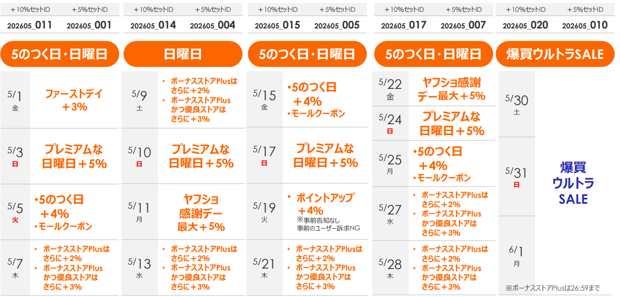 5月は大型イベントとして、爆買ウルトラSALEが予定されています。このイベントは、以前のヤフービッグボーナスに置き換わるイベントです。今後はヤフービッグボーナスはなくなり爆買ウルトラSALEと超PayPay祭が大型イベントとなります。