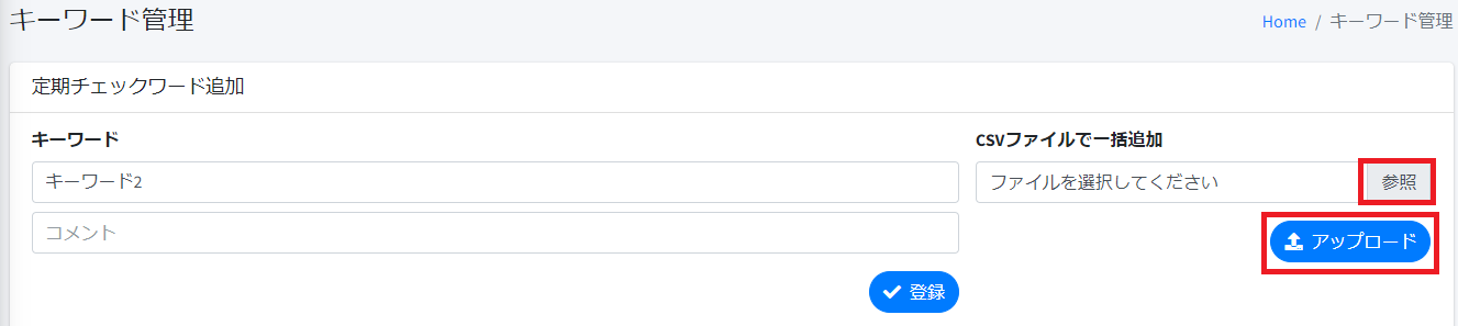 キーワード管理の画面で、「参照」ボタンを押して、作成したCSVファイルを選択します。そして「アップロード」ボタンを押せば、まとめてキーワードの登録が可能です。